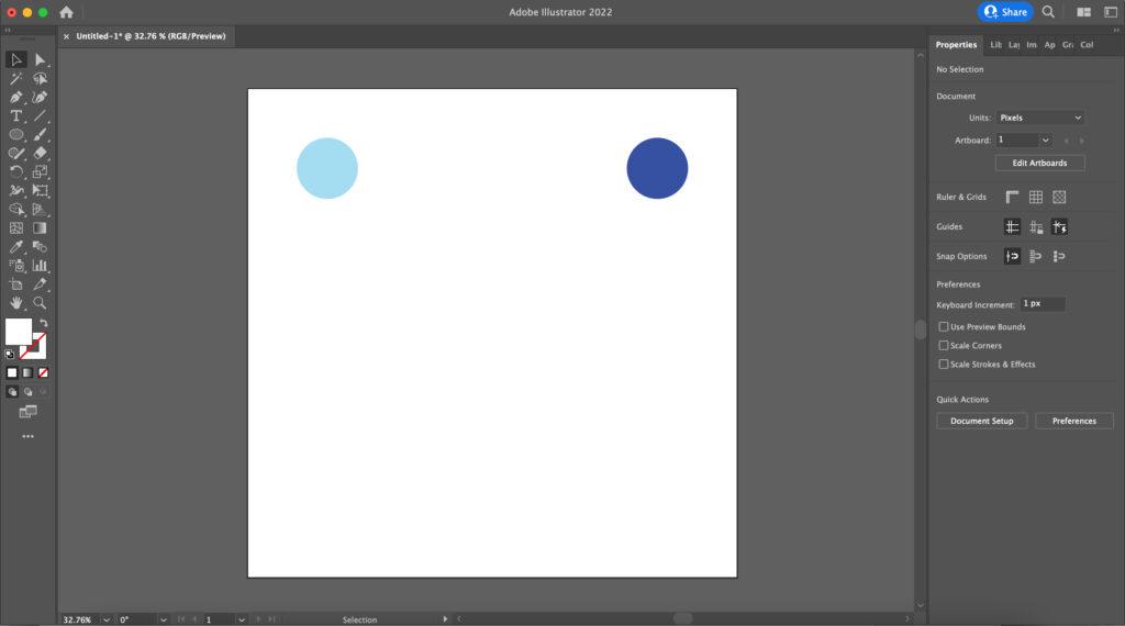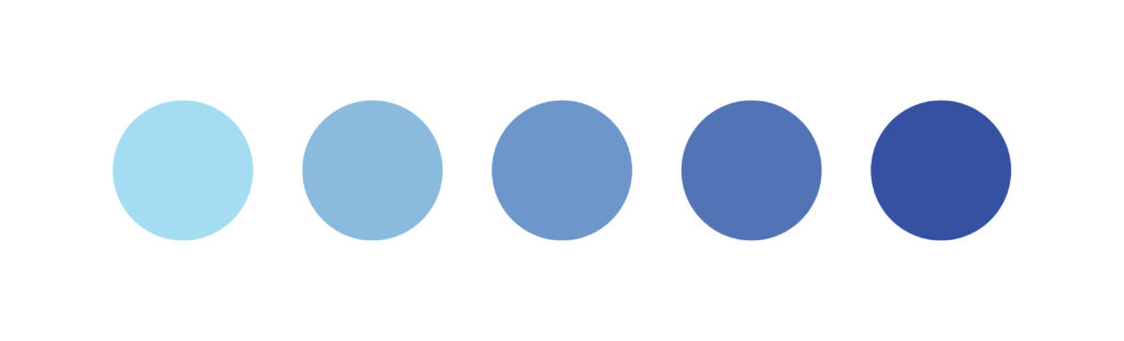I’m going to start with some example colors. If you’re following along, pick one light color and one darker color. The colors do not need to match, although I suggest choosing similar colors for a better result. For example, you could select one light shade of pink, one dark shade of pink, etc. I’m going to start with one light blue on the far left side of the artboard and one dark blue on the far right side.