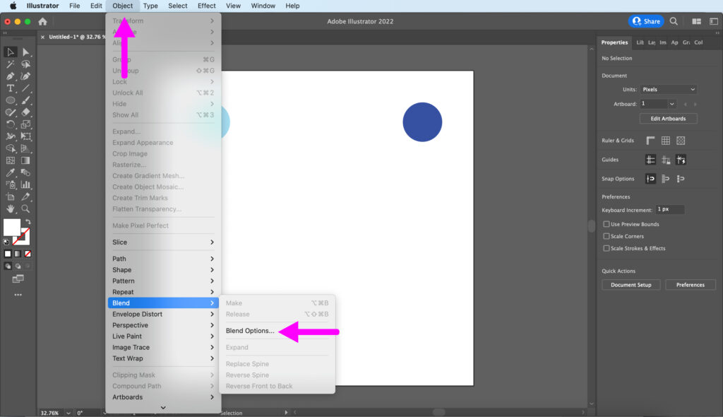 Now that we have two colors, let’s look at your blend setting options! Click “object” at the top of the page; you will see this window. Hover your mouse over the “blend” section and click “blend options.”