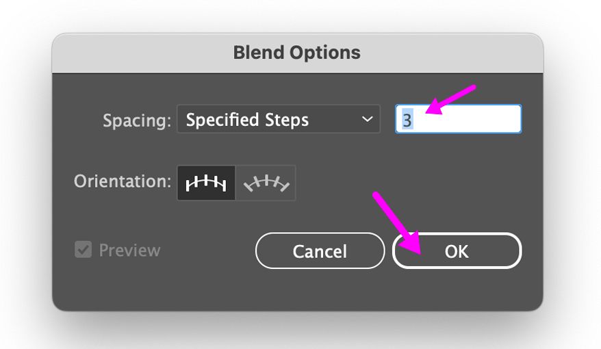When you click “blend options,” it will default select “smooth color.” We don’t want to smooth the color; we want to figure out what color exists between the two we selected. Click the drop-down menu and choose “specified steps.”