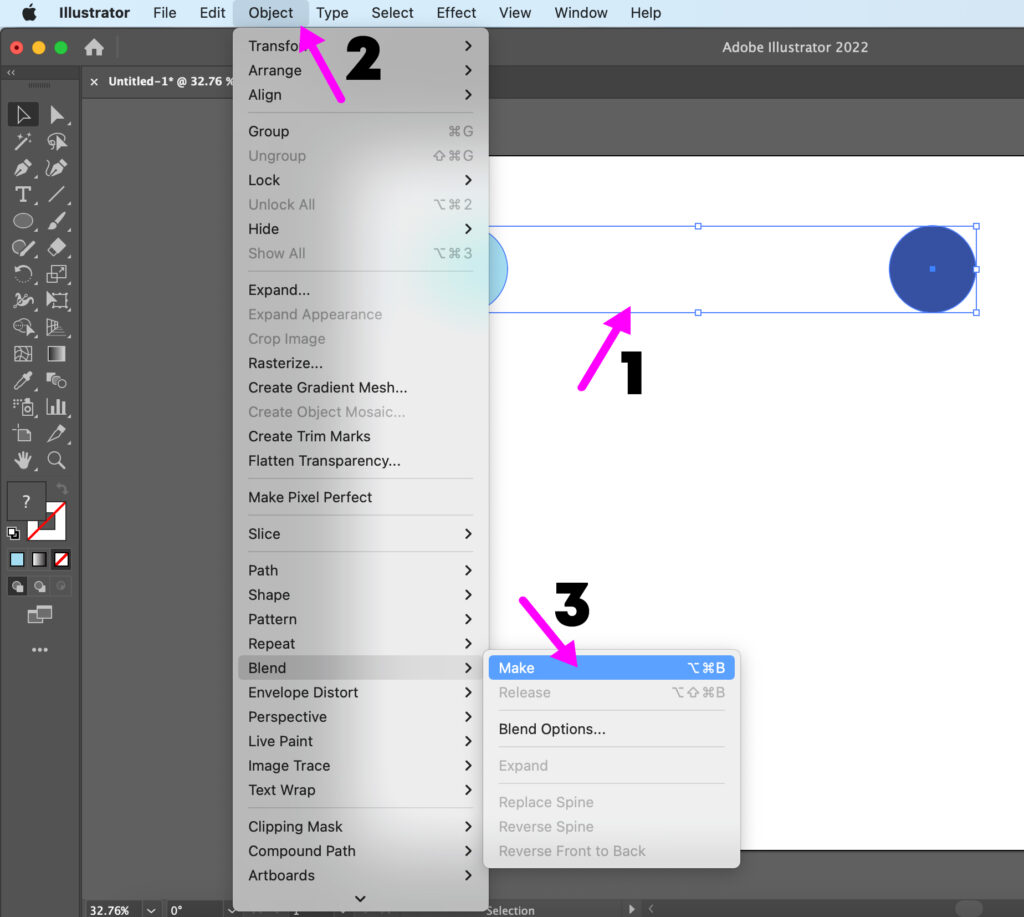 Are you frustrated because nothing happened? We’re not done yet! We just told Illustrator what it needs to do the next time we use the blending option. This step is where the magic happens. First, use the selection tool and select both of your colors. Next, go back to the top and click “object.’ Hover your mouse over “blend.” Finally, click “make.”