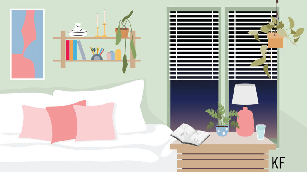 Pro tip: Get blackout curtains for your space, and if that’s not possible, a sleep mask is a great secondary option. Also, have you thought about your sheets or comforter? Look for sheets with breathable fabric; look for cotton, linen, or sheets with natural fibers to keep you cool. Remember, when it comes to sleep, you should treat yourself. Invest in some comfortable, lightweight pajamas and a pillow that fits your comfort needs.