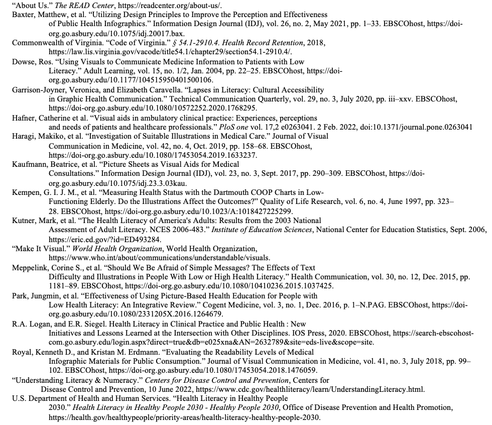 The synthesized literature presented will inform the research investigating the effectiveness of visual aids as tools to increase health literacy. The current project will also research visual aids’ efficacy in producing positive patient outcomes, behavior changes, and scenarios where visual aids should be employed for health communicative purposes. The study does not suggest that visual aids are the only tool to increase health literacy; instead, it explores their effectiveness in clinical practice. The literature review will use terms like a visual aid, illustration, infographic, or comic; the terms are used interchangeably. Provided definitions of visual aids and health literacy are guiding tenants for research. In addition, health communicative scholarly research creates the foundation for visual aids' effectiveness in increasing health literacy in clinical practice.